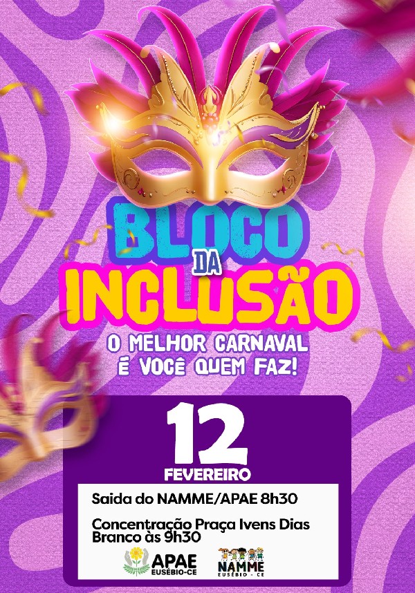 A Prefeitura de Eusébio, por meio da Secretaria Municipal de Educação, em parceria com o Namme e a Apae Eusébio, promoverá no próximo dia 12 de fevereiro, a partir das 9h30, o Bloco da Inclusão, na Praça Ivens Dias Branco, conhecida como Praça do Polo.